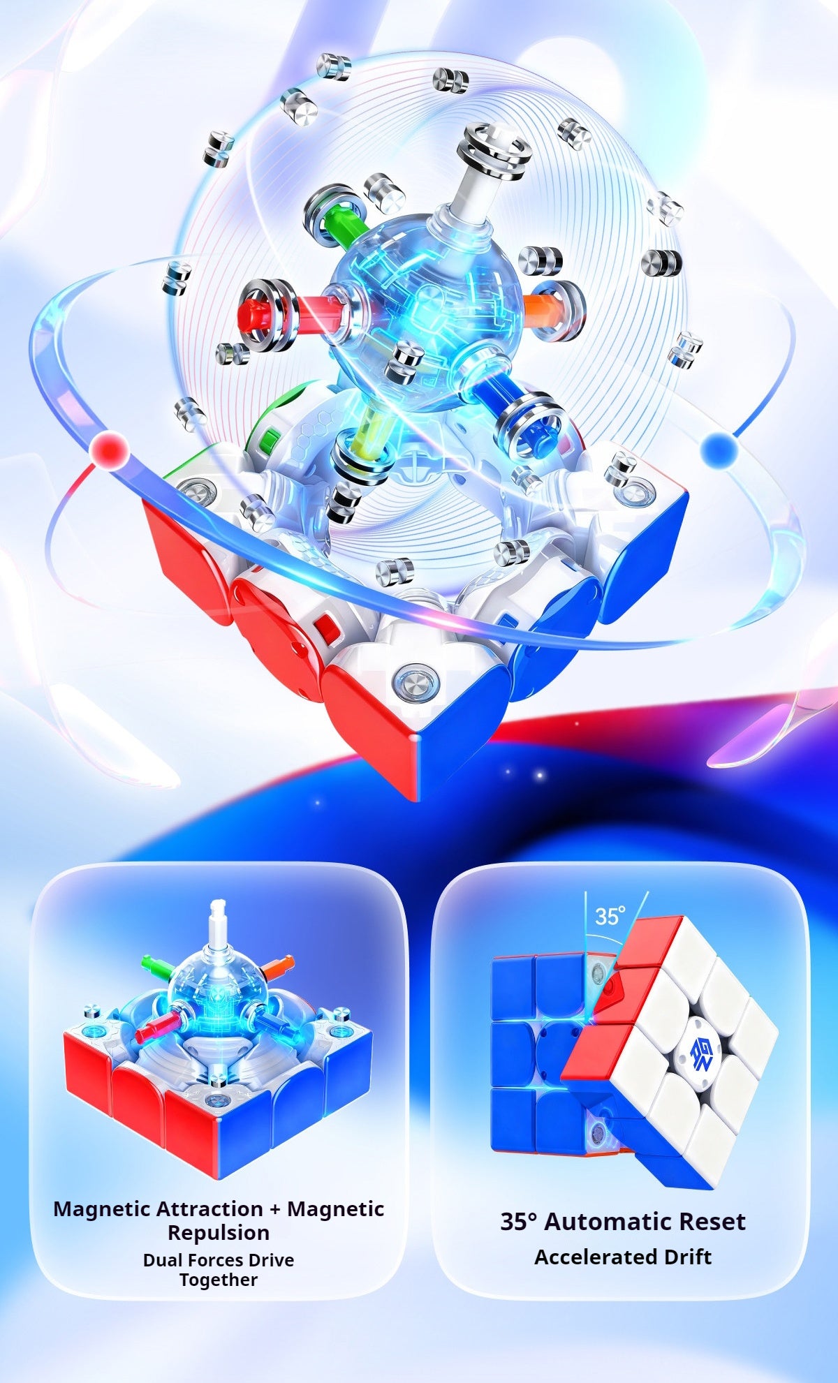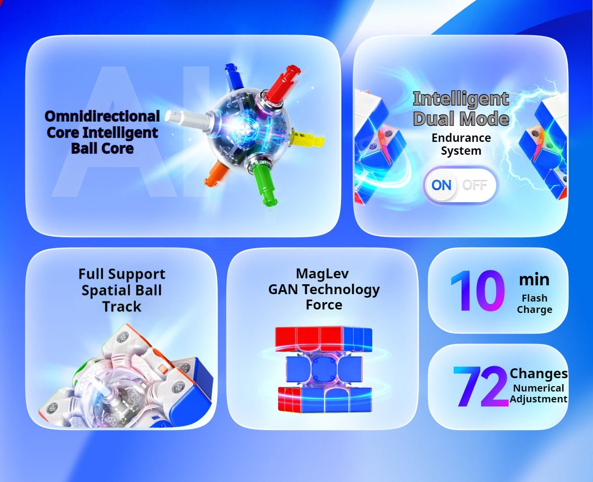 The GAN i4 MagLev Smart Cube is the full intelligent flagship upgrade over the GAN i3. Built with 0-Loss Hall-Effect Magnetic Sensing, 360° Full-Space Gyroscopic Monitoring, and a MagLev Magnetic Levitation Core, the i4 delivers faster data tracking, stronger stability, and dramatically extended battery life.